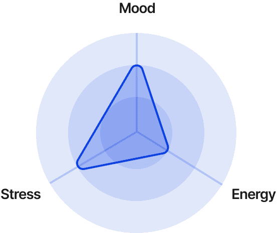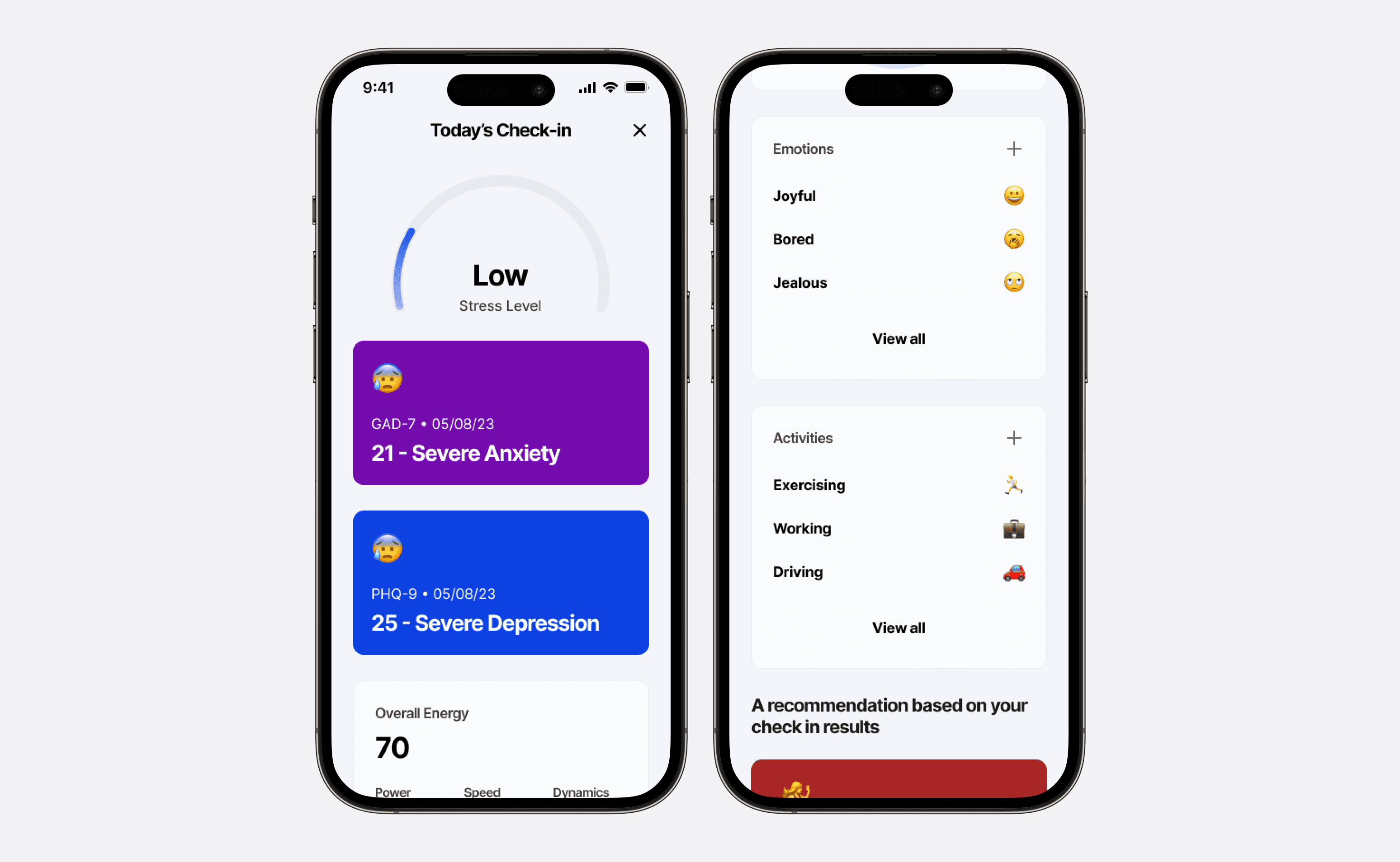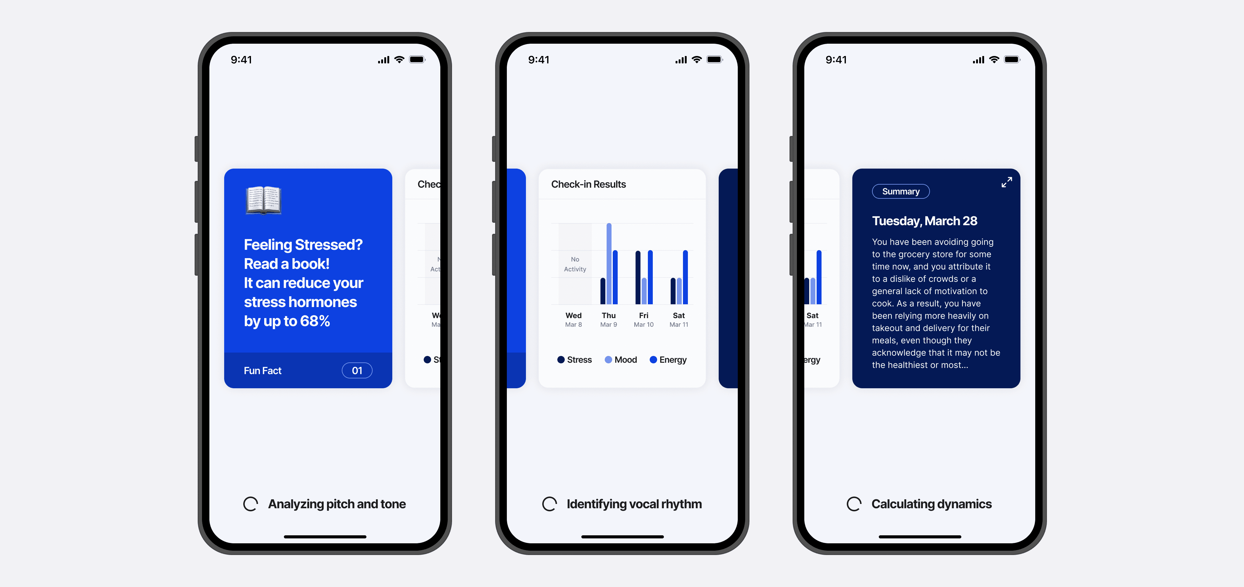 The product differentiated itself by turning AI voice analysis into clear stress and energy metrics. Voice check-ins unified daily activity logging with immediate emotional state feedback in a single, low-friction flow
