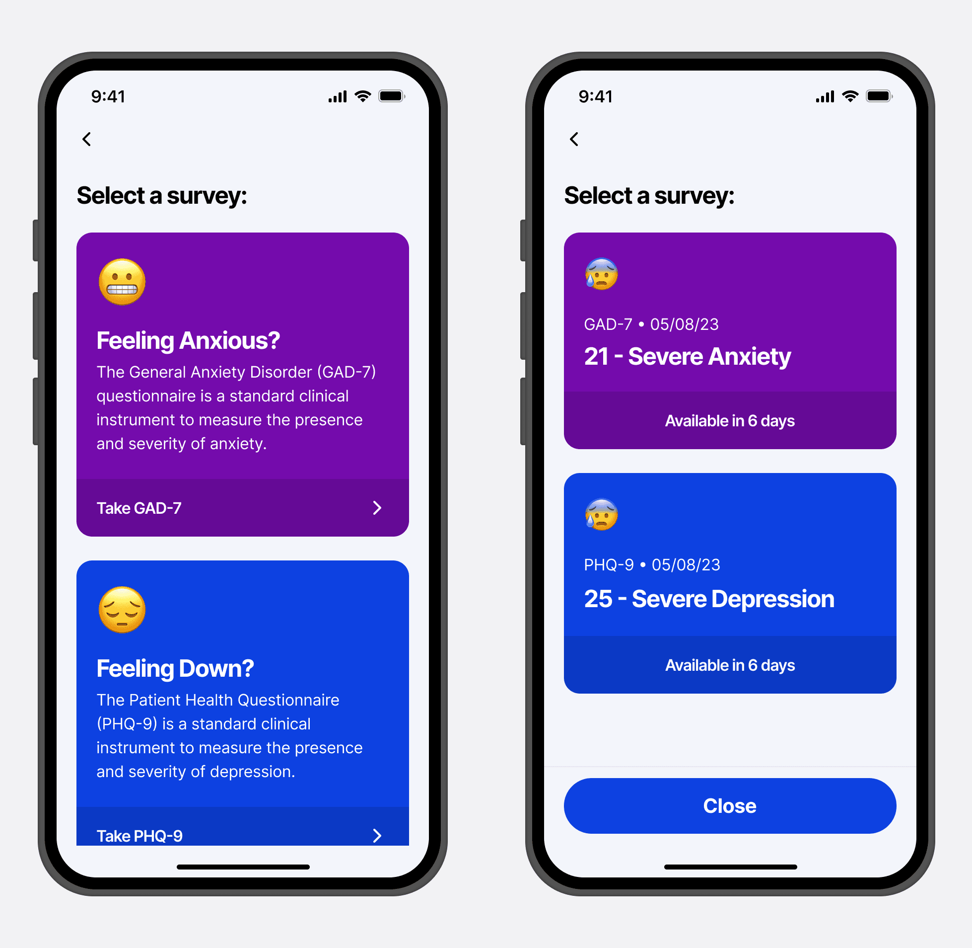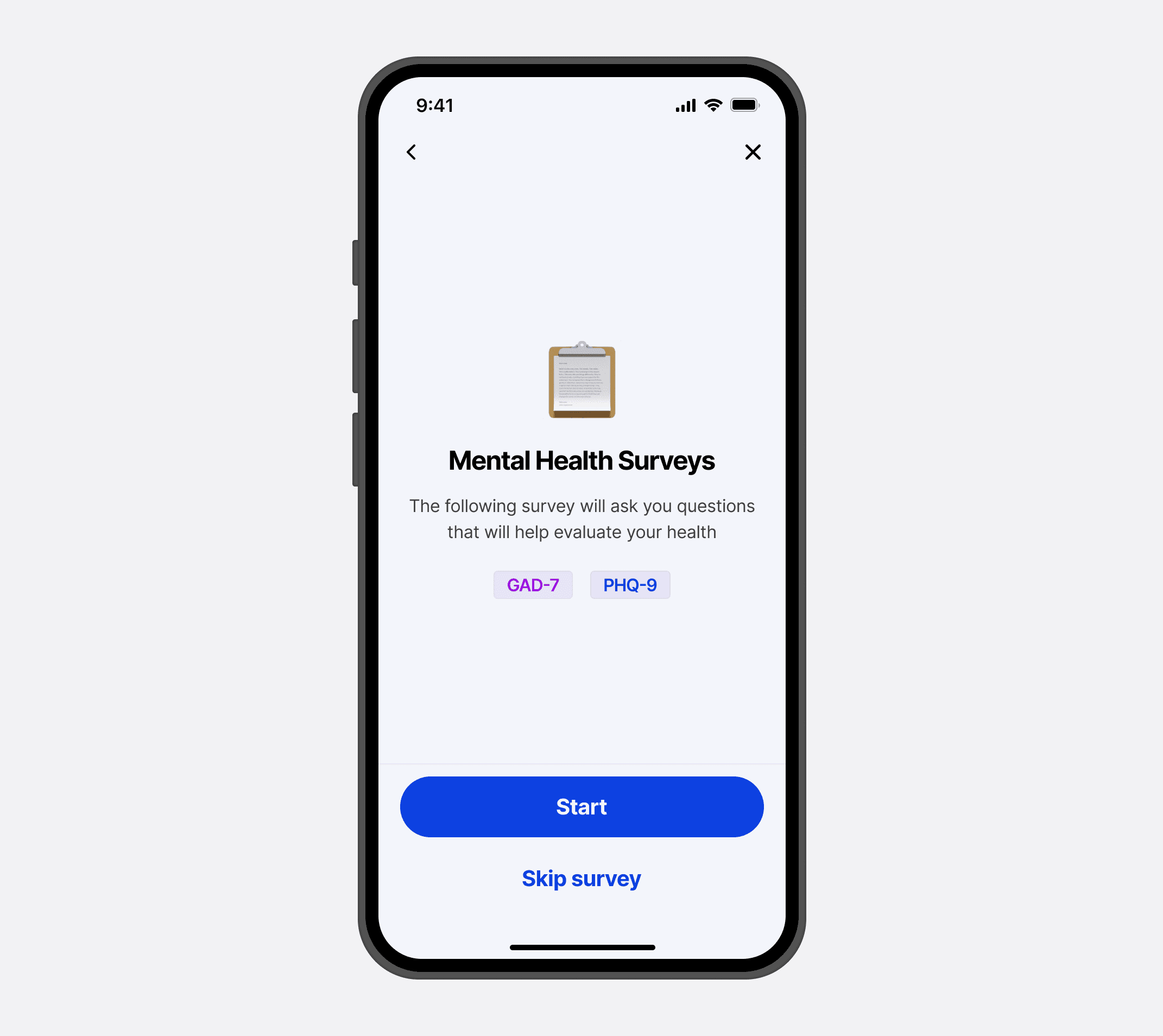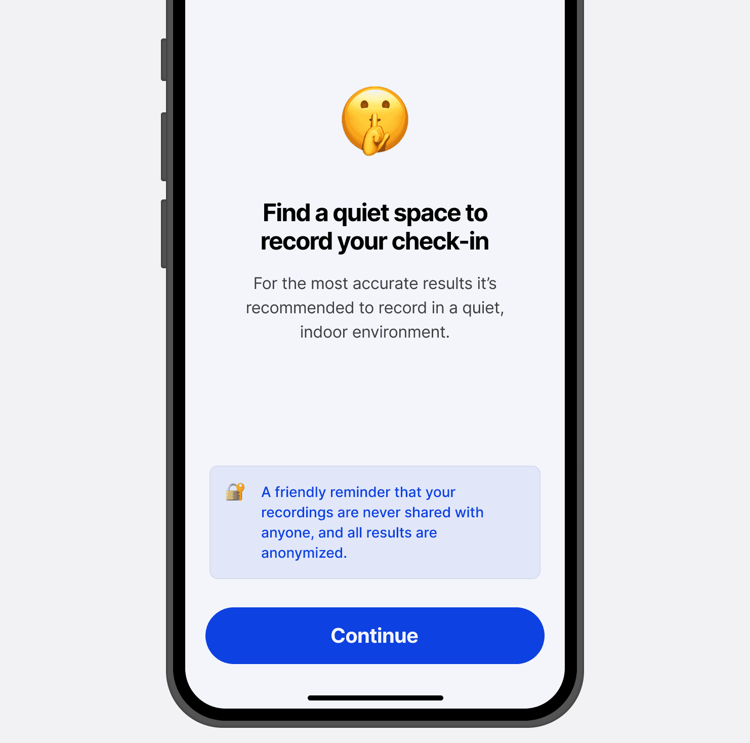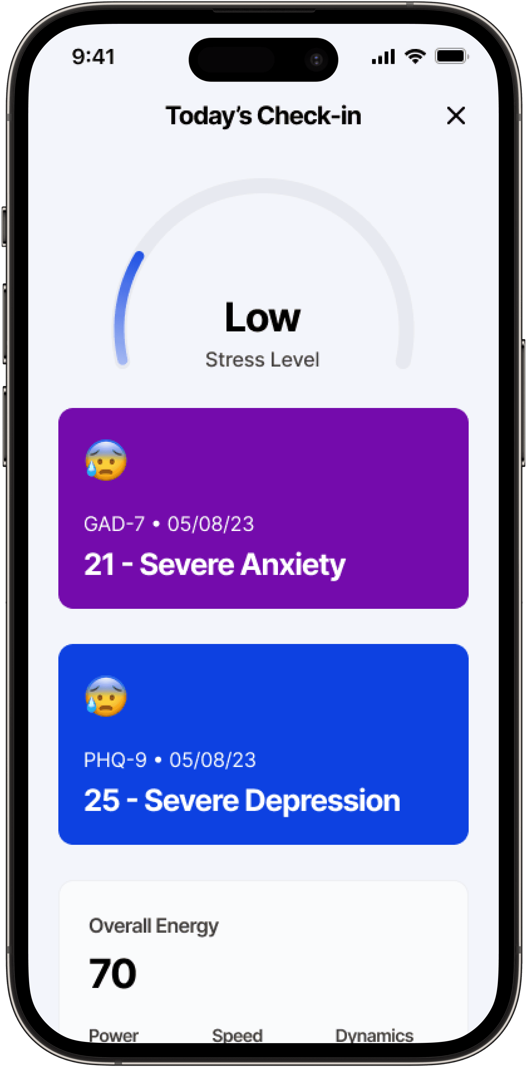 Before voice journaling, users complete a brief, clinically validated GAD-7 and PHQ-9 assessment to establish a mental health baseline. This baseline then informs and contextualizes the biometric insights captured during subsequent voice check-ins.